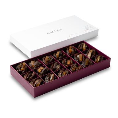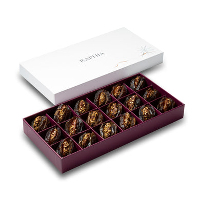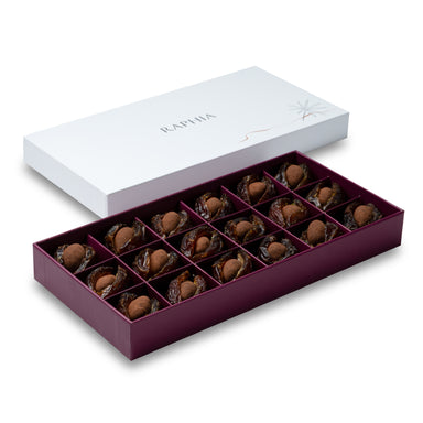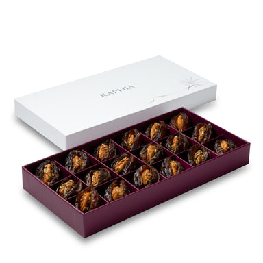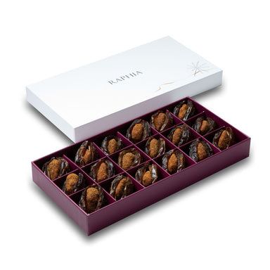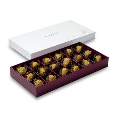 Raphia’s favour box presents an exquisite selection of premium Medjool dates, delicately filled with indulgent flavours—a refined gift offering an ...