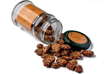 These gourmet pecan nuts are coated in a rich caramel glaze infused with a blend of five aromatic spices—anise, cinnamon, clove, coriander, and nut...