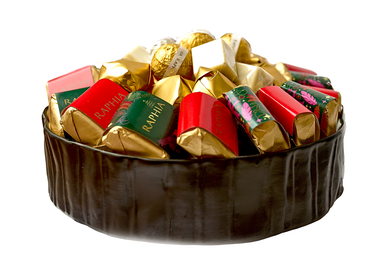 A refined centrepiece that radiates purity and celebration. Filled with Raphia’s signature sweets wrapped in tones of gold, green, and red, this cr...