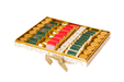 Nicholas box is an oriental box with golden geometric patterns inspired by Moroccan tiles. The medium sized box has a selection of eight different succulent, crunchy, praline chocolates and choco-bonbons.