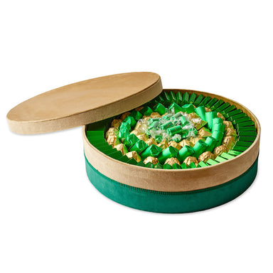 This jewel like Raphia display comprises a selection of opulent gold and forest green wrapped chocolates - as delighrful visually as they are delic...