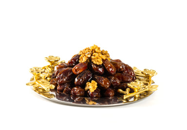 Elevate your Ramadan gatherings with Raphia’s dates assortment, elegantly arranged on a luxurious silver tray adorned with golden laurels.