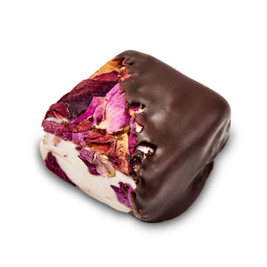 Balancing floral, nutty and delicate for a flavour romance. Dark chocolate, chewy Moroccan nougat, completed with rose petals. Individually wrappe...