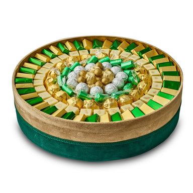 A statement piece that embodies festive luxury. Filled with an array of Raphia’s signature chocolates wrapped in vibrant gold and green, this sculp...